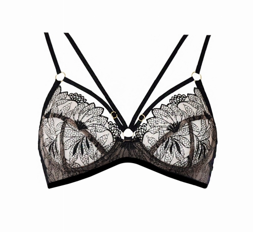 Wykonany z haftu - czarnego na cielistym tiulu. Metalowe elementy srebrne. Dostępny rozmiar 75B.
