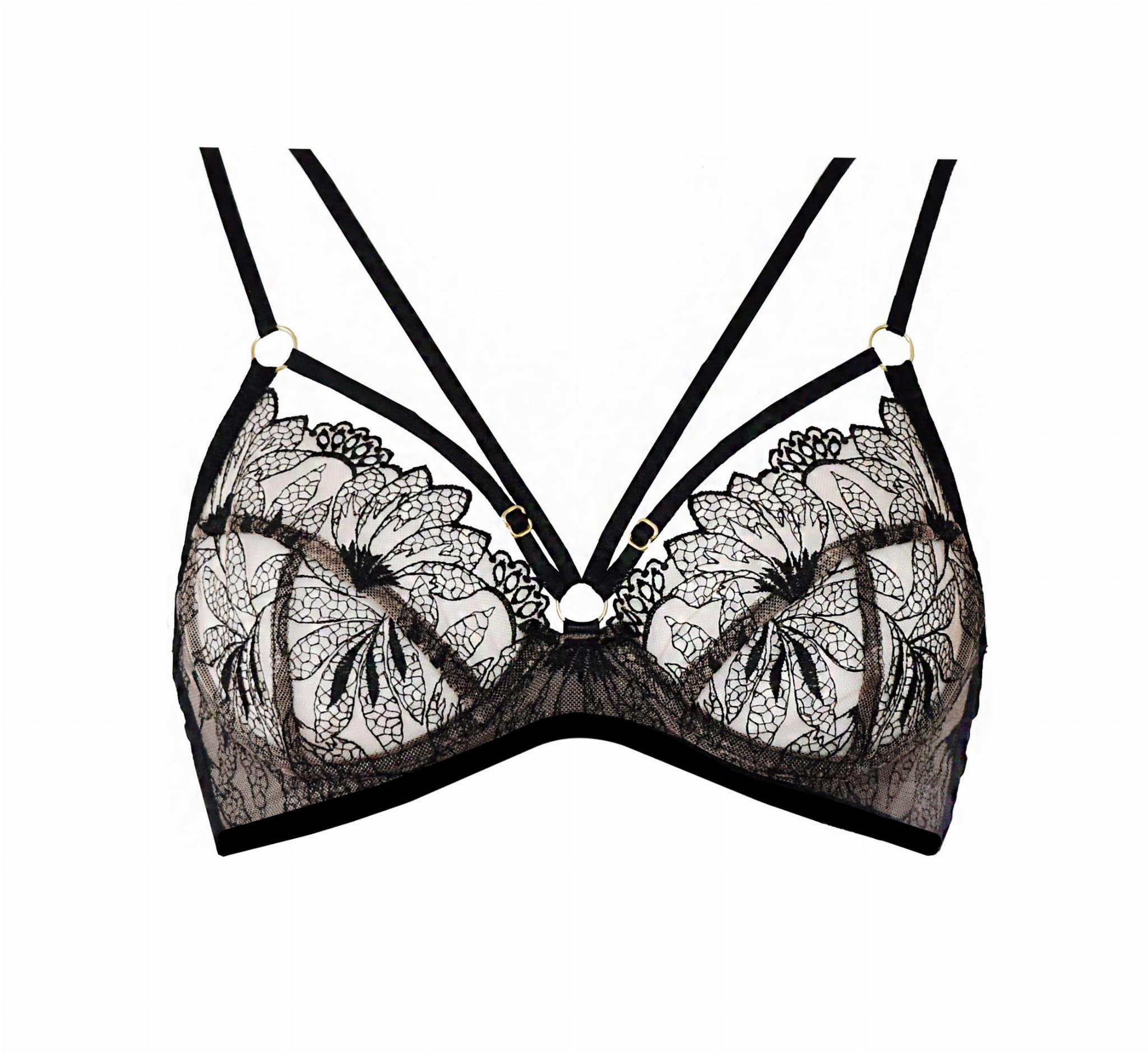 Biustonosz typu plunge, idealny dla biustu w rozmiarze małym, średnim i dużym. Ozdobiony delikatnymi paseczkami podkreślającymi dekolt.