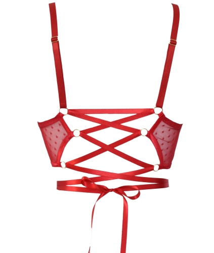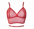Miękki biustonosz, bez fiszbin, typu braletka, z ozdobnym wiązaniem. Uszyty z delikatnej siateczki w kropki. Metalowe elementy złote. Dostępny rozmiar 70B