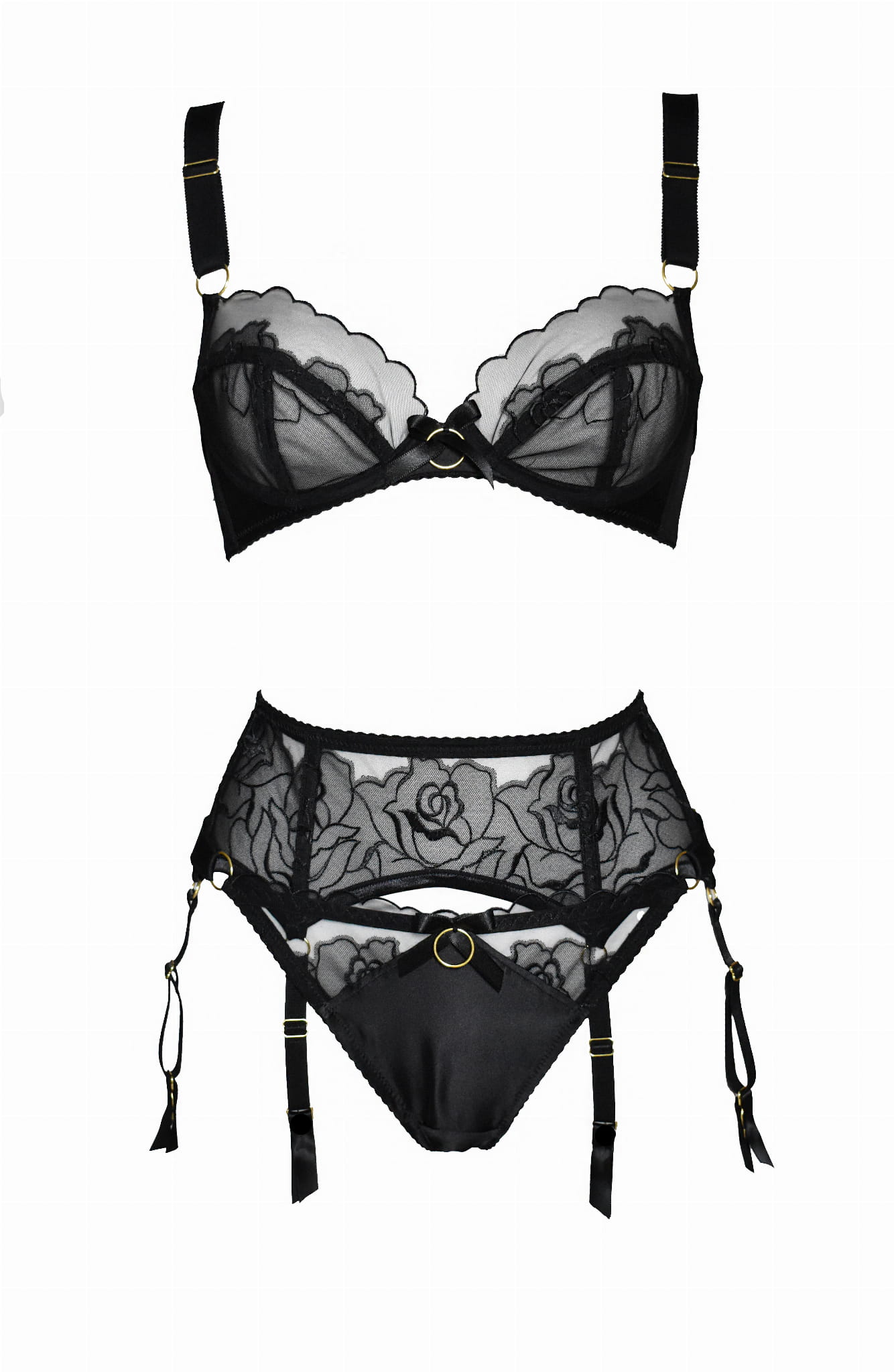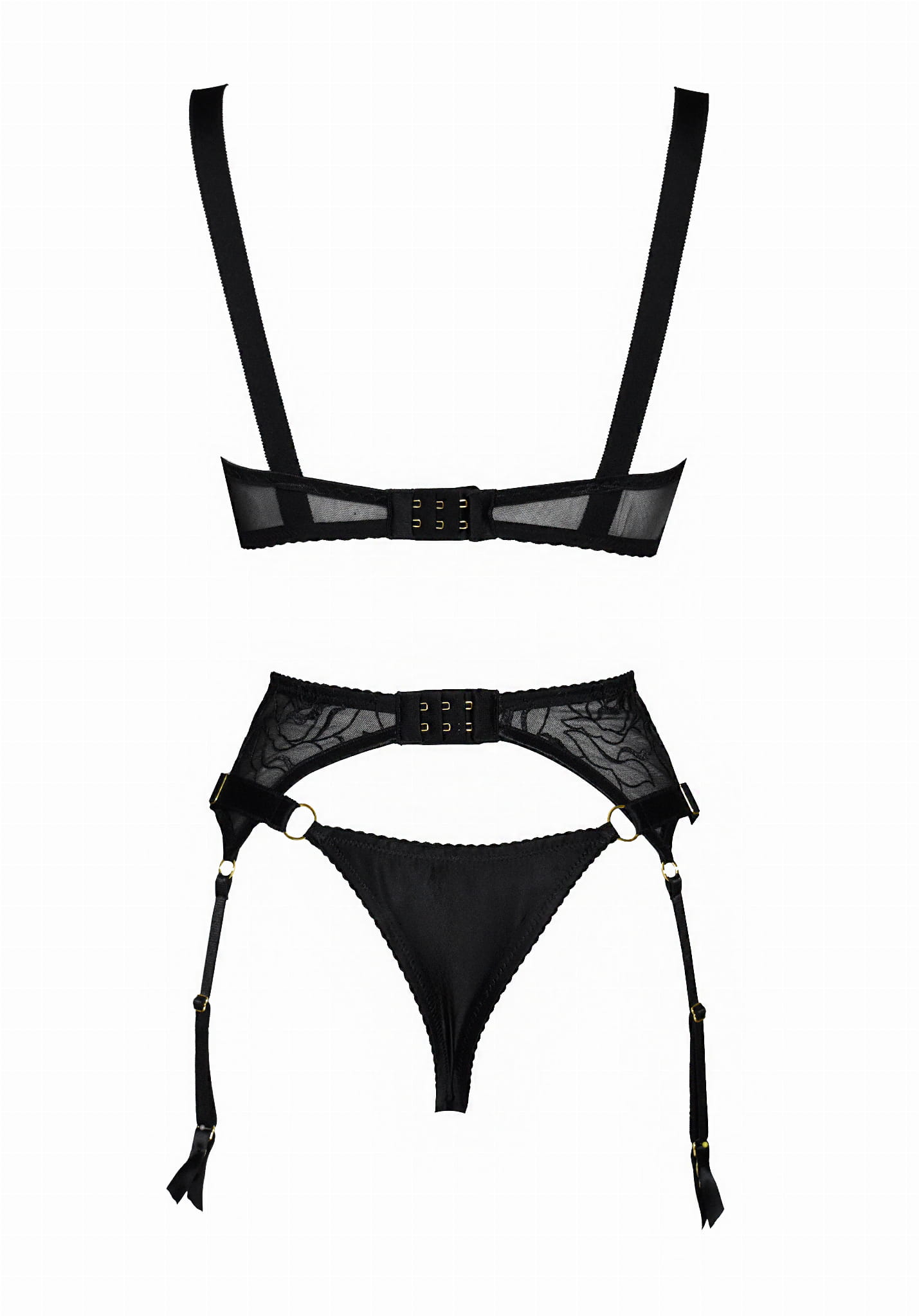 Komplet zawiera: biustonosz typu plunge, majtki stringi oraz pas do pończoch - 6 żabek. Bielizna wykonana jest z czarnego jedwabiu, kwiatowego haftu w czarnym kolorze czarnym. Majtki z regulacją boczną, która pozwala na zmianę obwodu w pewnym zakresie. Ramiączka regulowane, szerokie.