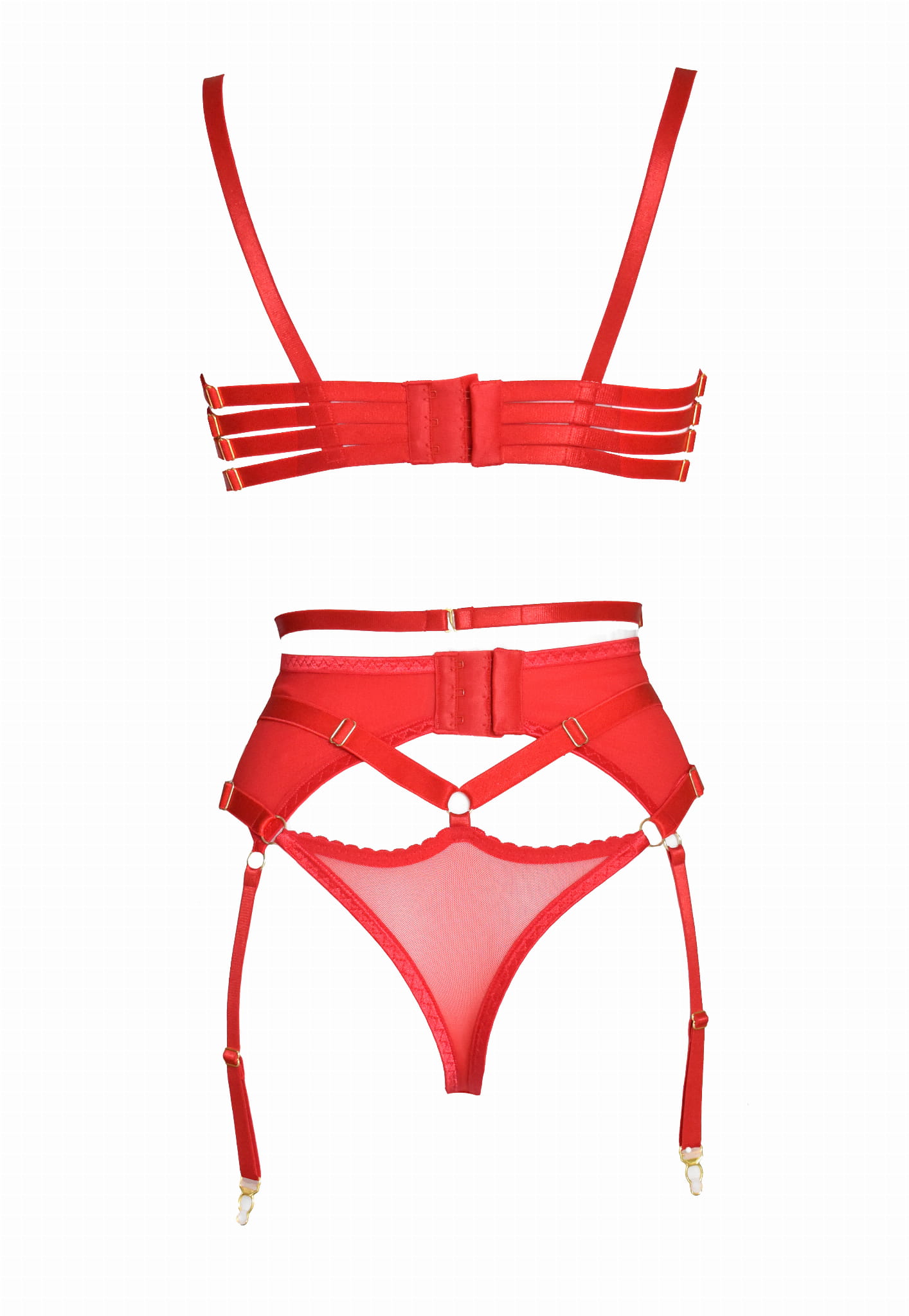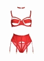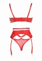 Pas do pończoch w klasycznym kroju ma 6 żebek i fiszbiny modelujące sylwetkę. Majtki - wysokie stringi z ozdobnymi paskami elastycznymi, z regulacją. Biustonosz ma regulowane ramiączka, obwód oraz miseczki wykonane z pasków.