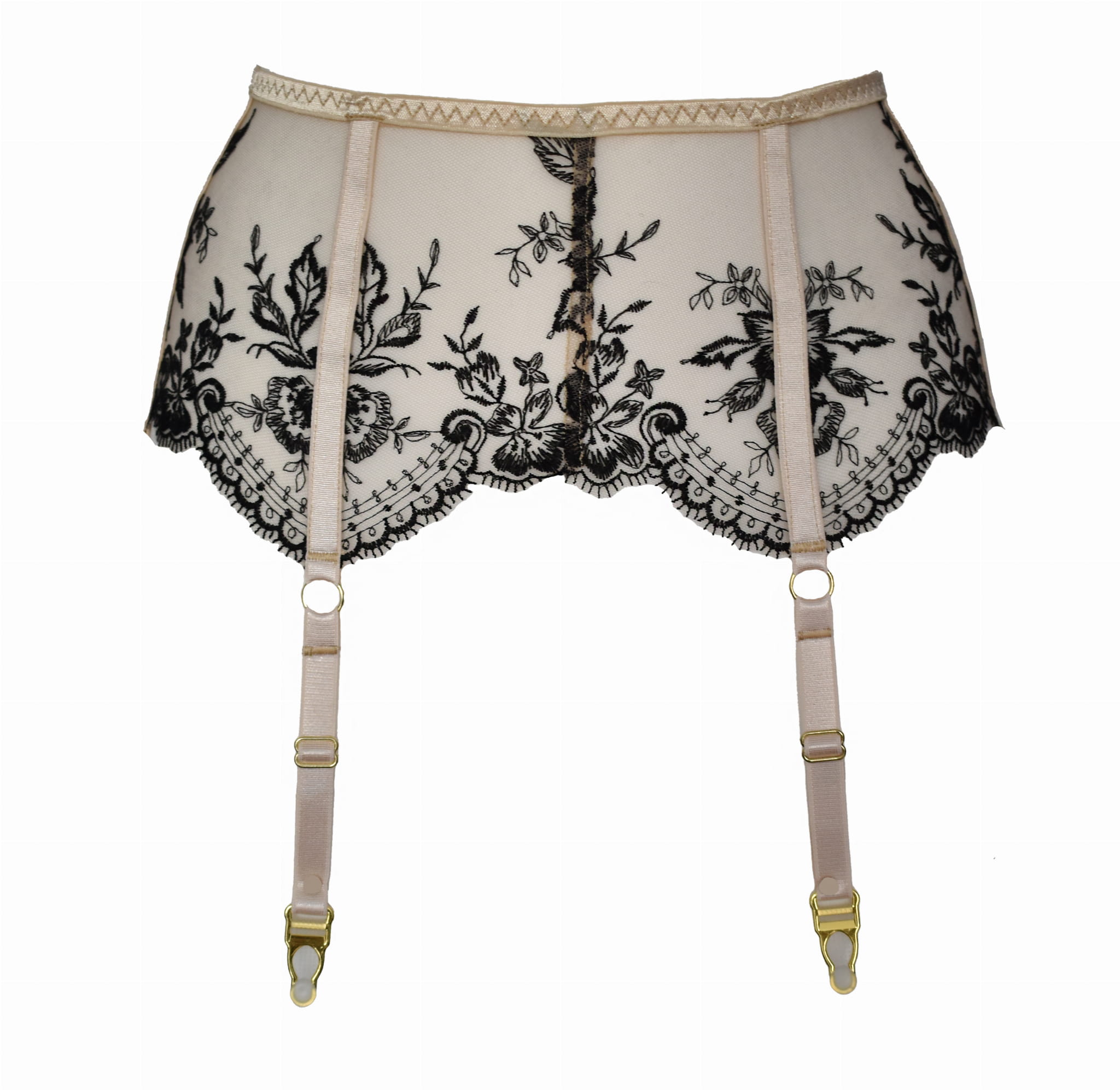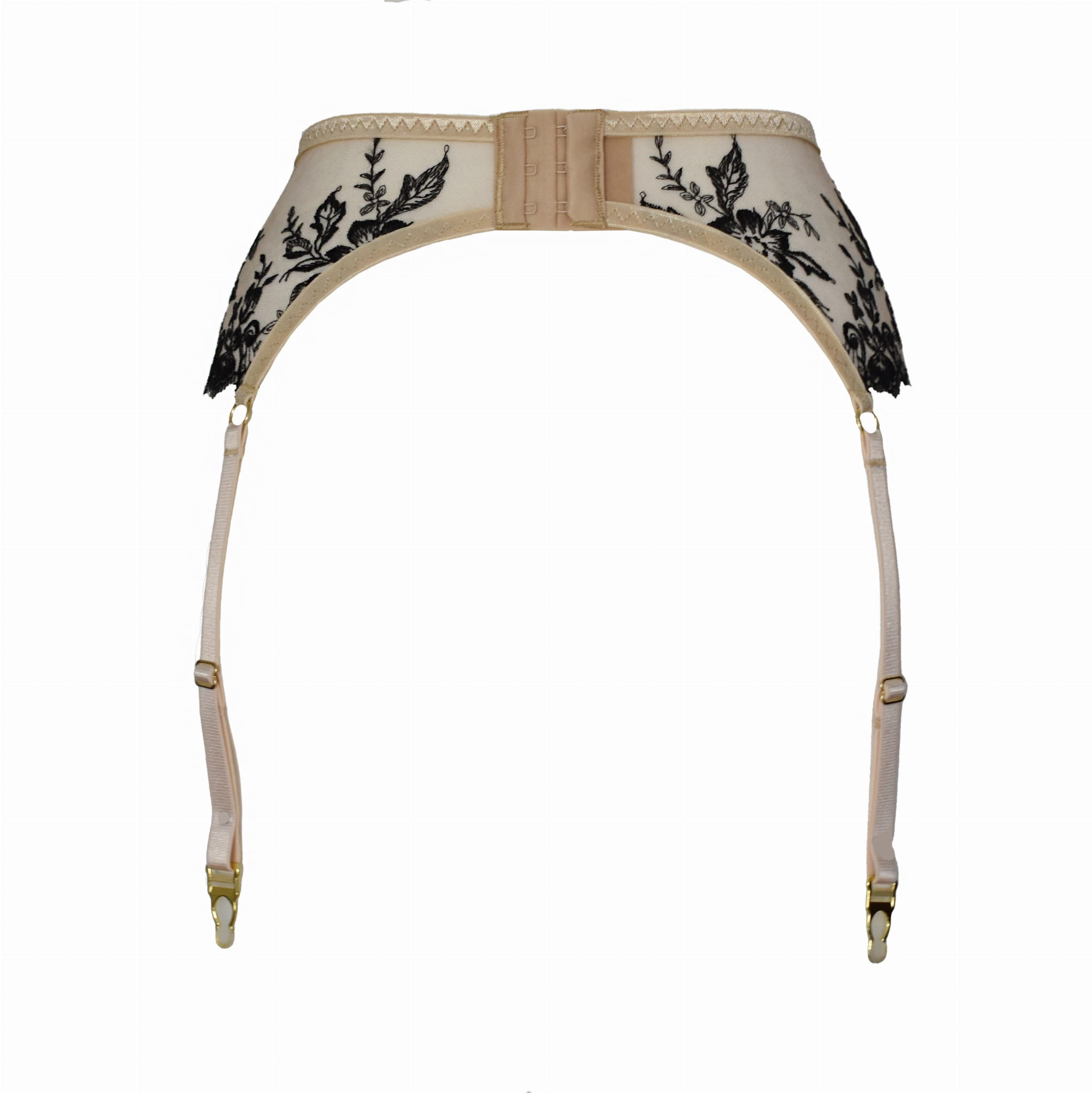 Pas do pończoch w klasycznym kroju, wykonany z czarnego haftu na cielistym tiulu, ma 6 żabek. Metalowe elementy złote. Dostępny rozmiar M.