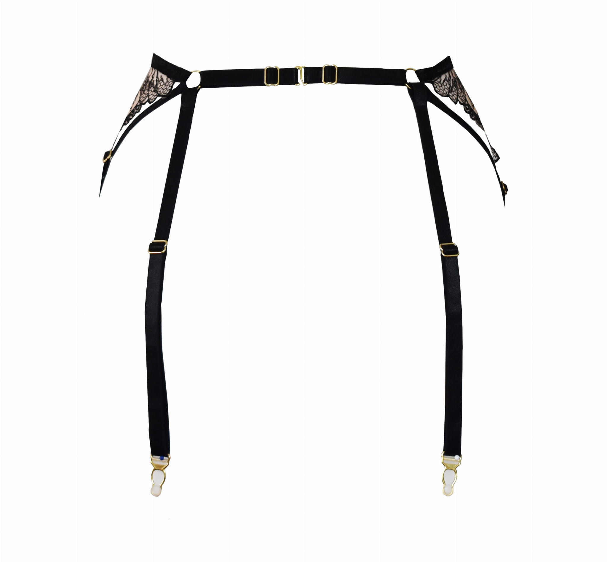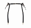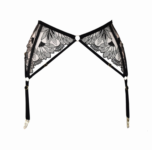 Pas do pończoch wykonany z haftu - czarnego na cielistym tiulu, ma 4 żabki, elastyczne paseczki z regulacją.