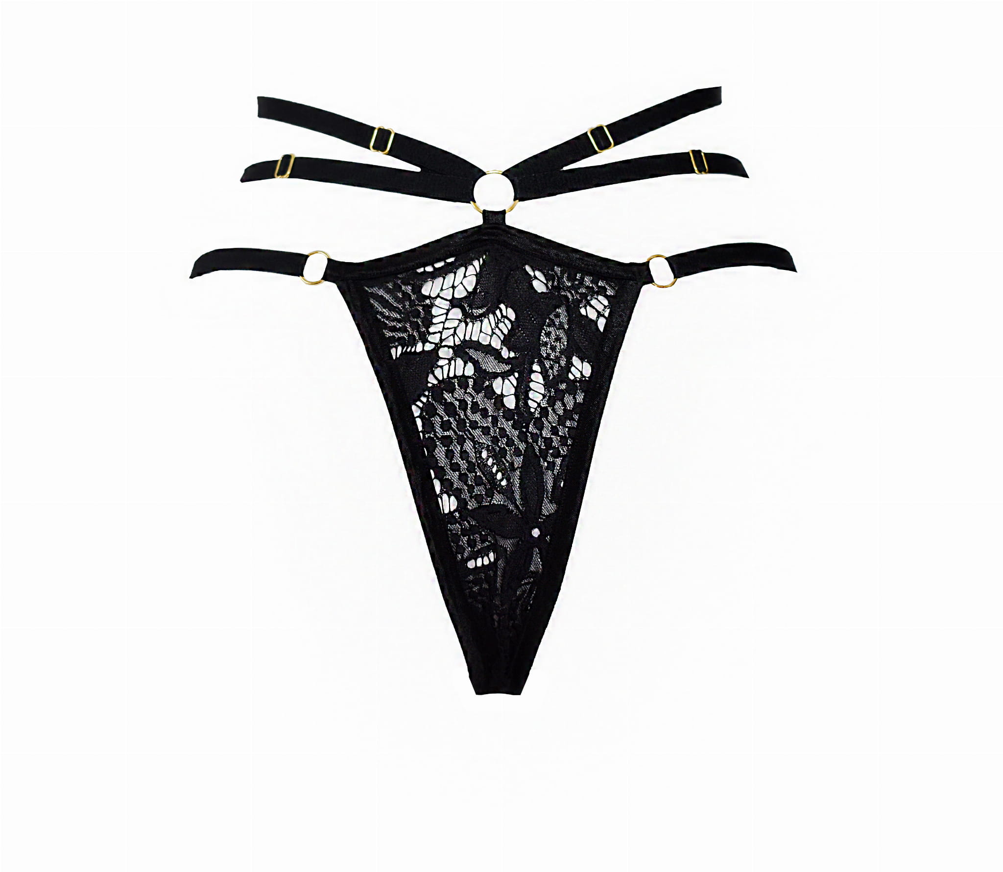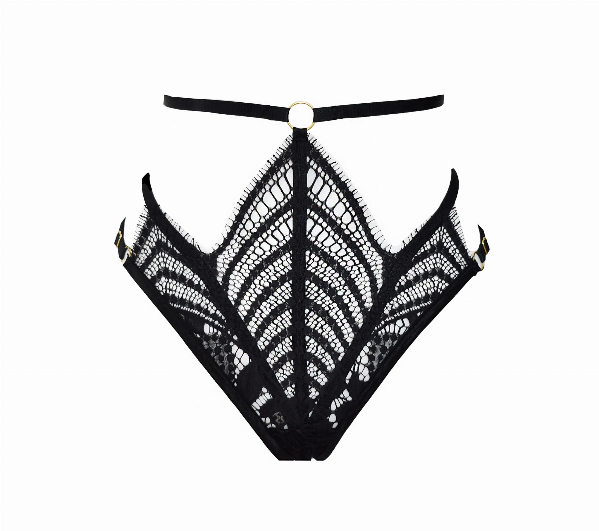 Wysokie stringi uszyte z eleganckiej koronki z rzęskami. Po bokach trzy elastyczne paseczki, z możliwością regulacji obwodów.